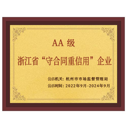 公司在2022年“守合同重信用”評(píng)比中,憑借良好的誠(chéng)信經(jīng)營(yíng)記錄和合同履約能力,經(jīng)過(guò)杭州市市場(chǎng)監(jiān)督管理局審核,榮獲浙江省AA級(jí)“守合同重信用”企業(yè)榮譽(yù)稱號(hào)。